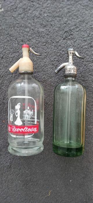 (2 sifones 25€). Uno es muy antiguo con la cabeza de plomo cromado. El verde 20€ y el de la Revoltosa 10€. NO negociable. Botellas, cristal, sifón