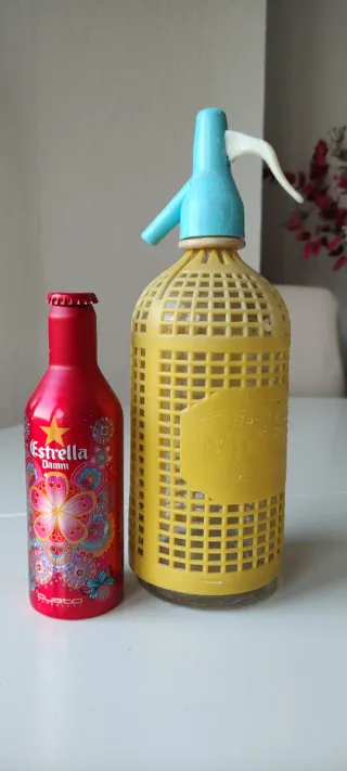 Se vende botella de aluminio de Estrella Damm con tapón/chapa original , del año 2008 junto con un sifón. - Botella de aluminio con diseño de CUSTO BARCELONA del año.2008. Edición limitada. - Sifón con dispensador. Diseño con rejilla plastica amarilla y cabezal azul y blanco. En buen estado considerando la antigüedad . No hago envíos. Cobro en efectivo.