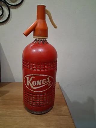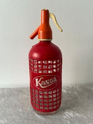 Botella de sifón de la marca Konga, con un diseño vintage y color rojo. - Botella de vidrio con cubierta exterior. - Mecanismo dispensador de color naranja y crema.