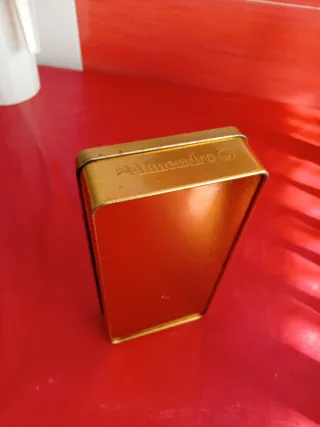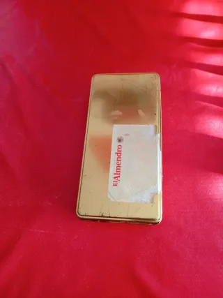 Caja de metal antigua de la marca El Almendro, ideal para coleccionistas. - Material: Metal - Color: Dorado - Diseño: Estampado floral