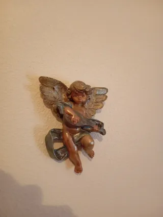 Conjunto de cuatro angelitos decorativos de escayola, pintados a mano. - Figuras de angelitos con alas. - Detallados acabados. - Ideales para decoración.