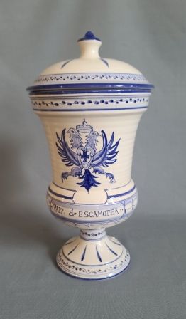 Pieza de cerámica decorada con motivos azules, ideal para coleccionistas o como elemento decorativo. - Diseño tipo copa de farmacia o botica. - Motivo heráldico con águilas y corona. - Inscripción PAIZ de ESCAMOTEA en la base. - Decoración con detalles florales y geométricos. - Medidas: 22 de diámetro x 43 de alto cms.