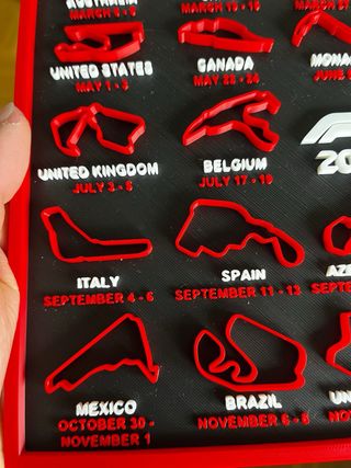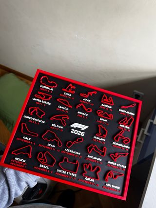 Calendario de la Fórmula 1 para la temporada 2026, con los circuitos de cada Gran Premio. - Diseño en relieve con los trazados de los circuitos. - Incluye fechas de cada carrera. - Marco rojo distintivo.