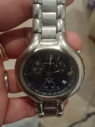 Reloj Sandoz con cronógrafo y esfera azul. - Bisel con escala taquimétrica. - Indicador de fecha. - Brazalete de acero inoxidable. No funcióna de ahy su precio, tiene más de 30 años, no se cual será la reparación