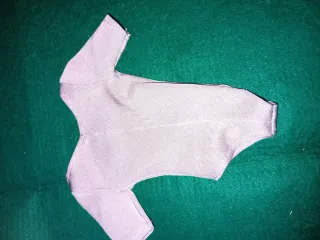Chaqueta de punto rosa para muñeca Nancy antigua. Presenta detalles de zigzag en azul marino y pequeños adornos dorados. - Diseño de manga larga. - Ribetes a juego en puños y bajo.