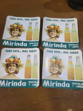 Conjunto de cuatro posavasos de Mirinda, con diseño de la marca. 20 euros los 4 posavasos - Cada posavasos muestra una publicidad vintage de Mirinda. - Presentan la frase Cada gota... más sabor. - Incluyen imágenes de la bebida y una modelo.