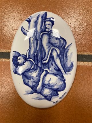Plato decorativo de cerámica con diseño de El Quijote. Ideal para coleccionistas o como pieza de arte. - Diámetro: 31 cm. - Técnica: Talavera. - Motivo: El Quijote.