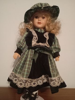 Preciosa muñeca de porcelana, ideal para coleccionistas. Luce un vestido a cuadros verdes y negros con detalles de encaje. Lleva un bonito sombrero a juego. Es una pieza única y delicada, perfecta para decorar o regalar. - Muñeca de porcelana. - Vestido de tela a cuadros. - Sombrero a juego. - Acabados de encaje.