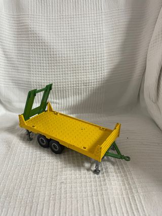 Remolque de plataforma de la marca Siku a escala 1:32. - Color amarillo. - Detalles en verde. - Ruedas negras.