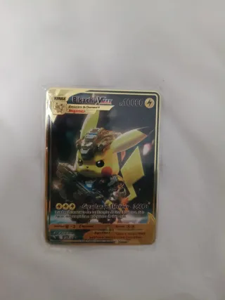 Carta coleccionable de Pikachu VMAX con un acabado dorado y metálico. Presenta un diseño único y llamativo. - Diseño de Pikachu VMAX. - Acabado dorado y metálico.
