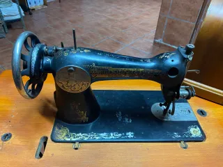 Máquina de coser Singer antigua con su mesa original. La mesa tiene un acabado de madera y dos cajones laterales. - Diseño clásico de máquina de coser. - Mesa de madera con dos cajones. - Asa de transporte en la máquina.