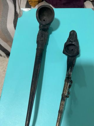 Conjunto de dos objetos decorativos con tallado detallado. - Diseño con forma de cabeza de animal. - Material oscuro, posiblemente madera o resina. - Uno de los objetos incluye una cadena decorativa con un pequeño colgante.