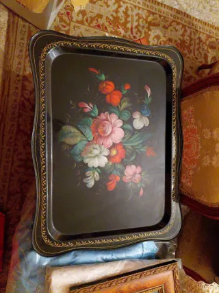 Preciosa bandeja vintage pintada a mano en la URSS. Presenta un diseño floral vibrante sobre un fondo oscuro. - Pintura floral detallada. - Borde decorativo dorado. Medidas 57x43 cm