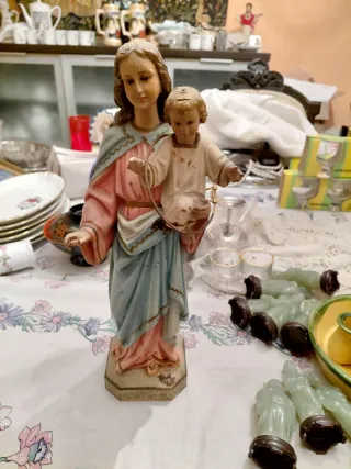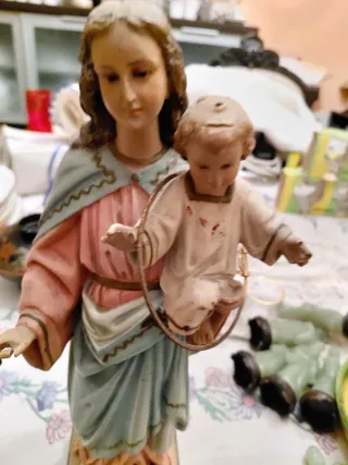 Figura religiosa de la Virgen María con el niño Jesús. - Detallada escultura. - Colores pastel en vestimenta. - ver fotos para más información.
