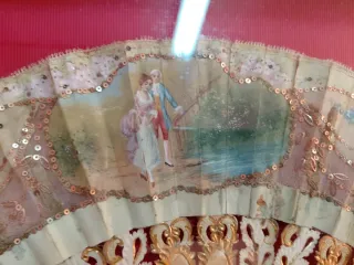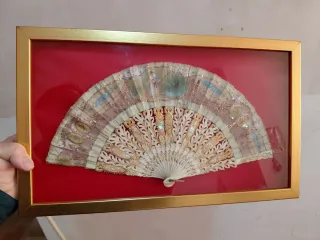 Precioso abanico antiguo, elaborado artesanalmente con nácar. - Material: Nácar - Hecho a mano - Marco dorado - Fondo rojo