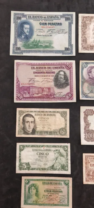 Colección de billetes antiguos del Banco de España. - Billetes de 100 pesetas. - Billetes de 50 pesetas. - Billetes de 5 pesetas. - Billetes de 1 peseta.