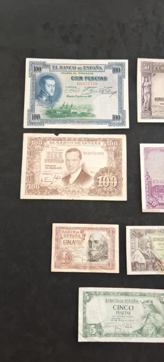 Conjunto de billetes del Banco de España. - Billetes de 100 pesetas. - Billetes de 50 pesetas. - Billetes de 1 peseta. - Billetes de 5 pesetas.