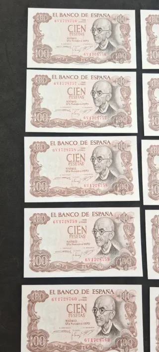 Lote de billetes de 100 pesetas del Banco de España. Cada billete PLANCHA. SERIE CORRELATIVA. - Serie GV1725756 - Serie GV1725761 - Serie GV1725757 - Serie GV1725755 - Serie GV1725759 - Serie GV1725762 - Serie GV1725763 - Serie GV1725764 - Serie GV1725760 - Serie GV1725765