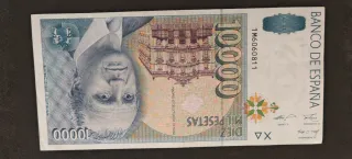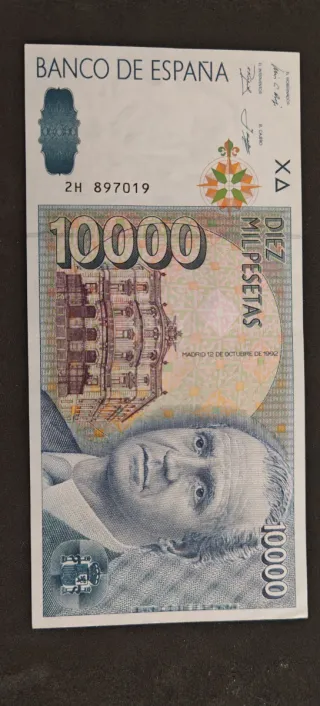 Billete de 10.000 pesetas del Banco de España, emitido en Madrid el 12 de octubre de 1992. CALIDAD SIN CIRCULAR - Denominación: Diez mil pesetas. - Serie: 2H 897019. - Fecha de emisión: 12 de octubre de 1992.