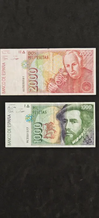 Dos billetes del Banco de España, uno de 1000 pesetas y otro de 2000 pesetas. - Billetes de colección. - Diseño detallado con retratos. - Serie de 1000 pesetas: 4P3210440. - Serie de 2000 pesetas: 466618237.