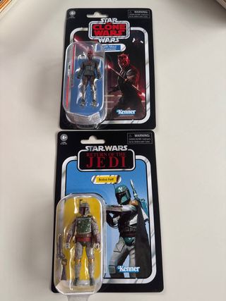 Colección de figuras de Star Wars de la marca Kenner. Incluye a Darth Maul de La Guerra de los Clones y a Boba Fett de El Retorno del Jedi. - Figura de Darth Maul. - Figura de Boba Fett.