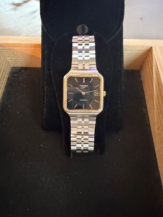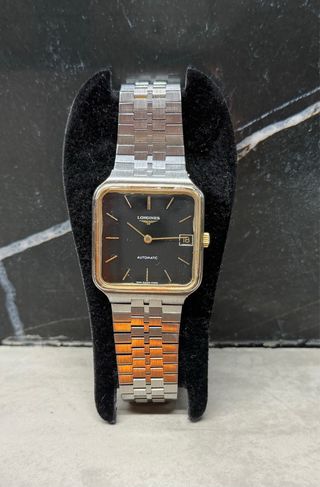 Reloj Longines automático vintage con movimiento L.994.1. Un clásico con un diseño atemporal. - Esfera negra. - Caja y brazalete de acero y oro. - Ventana de fecha. - Cierre desplegable. Se puede regular la correa quitando eslabones. La tija tiene posicion de fechador y posición de hora separada. Caja de 30mm