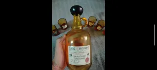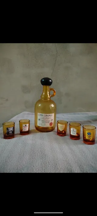 Conjunto de colección de whisky, ideal para los amantes de las bebidas espirituosas. - Botella de vidrio ámbar con tapón negro. - Incluye cinco vasos a juego de vidrio ámbar. - Cada vaso tiene una etiqueta distintiva.