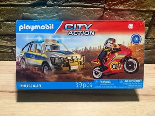Q1 -ESTADO: Perfecto estado, fue abierto y mostrado, bolsas precintadas, caja dañada ✅ PLAYMOBIL | Action Heroes | Persecución con camioneta policial | Juguete policial con Luces y Sonidos | Juguete de Aventuras Lleno de acción | para Mayores de 4 años | 71875 • ACCIÓN POLICIAL: set de persecución PLAYMOBIL para niños desde 4 años • VEHÍCULO REALISTA: pick-up con espacio para 4 figuras, accesorios desmontables y soporte para moto • MOTO INCLUIDA: el ladrón escapa mientras la policía persigue con luces y sirena • JUEGO DE ROL: fomenta imaginación y aventuras llenas de acción • CONTENIDO: coche, moto, 2 figuras y accesorios
