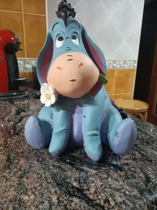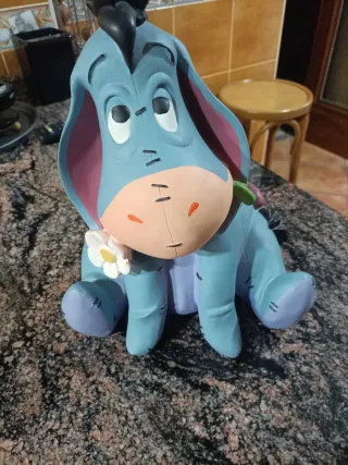 Figura decorativa del personaje Eeyore de Disney. Ideal para coleccionistas o fans de Winnie the Pooh. - Color azul. - Detalle de flor blanca en el cuello. - Material: Cerámica o resina (aprox.).