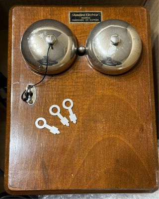 Pieza de colección Western Electric, fabricada en Estados Unidos. Su diseño combina madera y detalles metálicos dorados. Teléfono de campaña americano, Años 50. Pesa 3 kg y mide 15x13 base x 20 cm de alto. Hay que restaurarlo, pero es un teléfono raro. - Estructura de madera con refuerzos metálicos en las esquinas. - Altavoz circular con rejilla metálica. - Elementos decorativos y funcionales en latón.