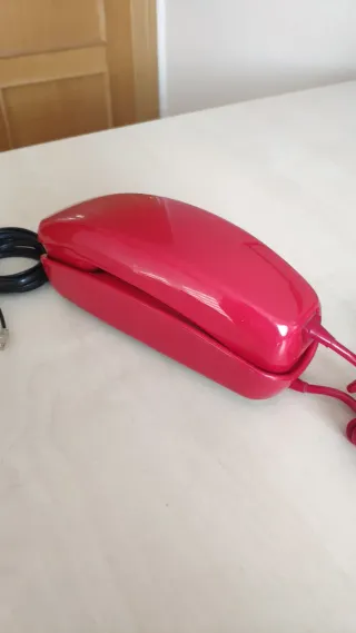 Teléfono de estilo góndola en color rojo. Un diseño clásico que evoca épocas pasadas. Está en buen estado, sin golpes ni roturas. - Cable en espiral. - Cable de conexión.