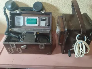 Conjunto de teléfono y centralita. Totalmente original. Lleva sus dos manivelas. Se retiró funcionando. Tarragona. No hago envíos. 609892449. Peso aproximado 11 kilos las dos piezas - Estuche de madera. - Auricular con cable en espiral. - Placas metálicas con diagramas.