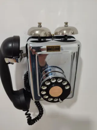 Teléfono de pared con un diseño clásico y elegante. Su acabado Cromado y negro le da un toque retro.es un teléfono de Estándar Eléctrica Español 1924 se vende para decoración, atrezo etc.Está reacondicionado! Se entrega con cable RJ11 el díal de Marcacion gira y retroce Una auténtica joya de la telefoníaEspañol es el más parece a las primeras cabinas públicas Españolas. - Fabricado en España. - Marcación giratoria. - Dos campanas superiores.