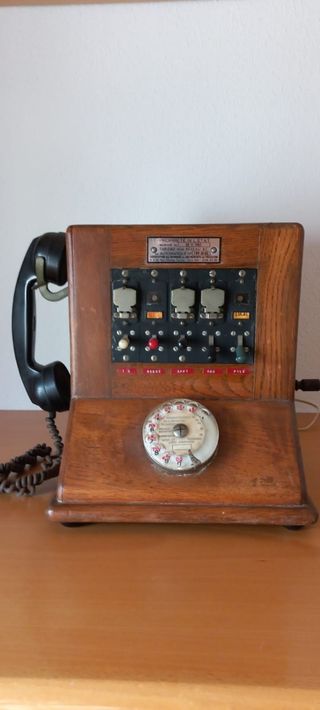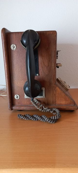 Antigua centralita de teléfono en madera de roble, cableada para uso como teléfono fijo 100% funcional.