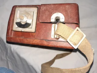 Este es un teléfono antiguo con un diseño clásico. - Carcasa de color marrón. - Correa de tela para transporte.