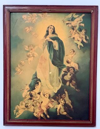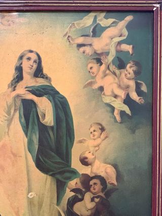 Preciosa y antigua oleografia encerada de la virgen “ La Inmaculada”. Perfectamente conservada e ideal para decoración y culto. Mide 45x35 cms. Atiendo también por teléfono y whasapp. 630582070.