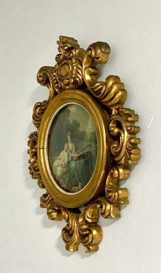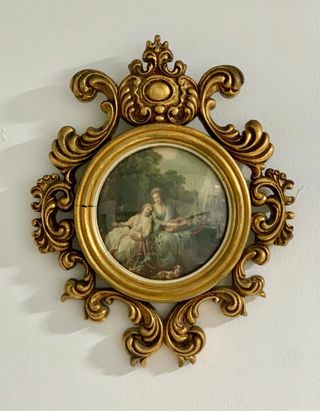 Preciosa lámina antigua de escena clásica enmarcada con cristal en marco dorado de resina. Mide 26x22 cm. Atiendo también por teléfono y WhatsApp.