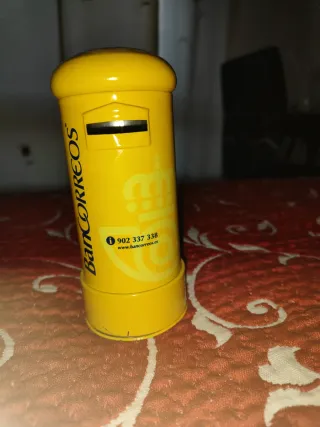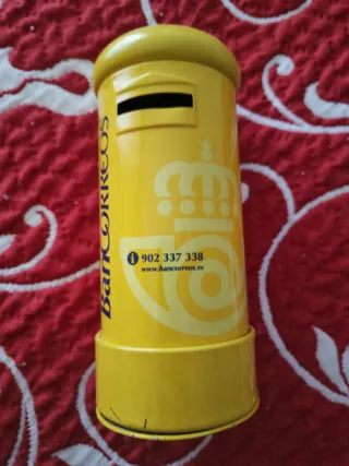 Hucha con forma de buzón de Correos, fabricada en metal. - Diseño icónico de buzón de Correos. - Material metálico resistente. -Es un artículo de colección popular entre los entusiastas de Correos. - Color amarillo llamativo. -Tiene unas dimensiones aproximadas de 16 cm de alto y 7 cm de diámetro. -La base se puede quitar para acceder al dinero guardado en su interior.
