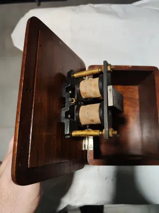 TELEFONO DE PARED ANTIGUO CON MAGNETO. Este teléfono no es un modelo doméstico corriente, sino un teléfono de pared antiguo con magneto (manivela), del tipo que se utilizaba en España y Europa entre 1900 y 1930. -Estaba ubicado dentro de una estación de ferrocarril. -La manivela genera corriente al girarla → esto hacía sonar los timbres en la central o en otro teléfono del mismo circuito. -Las campanas metálicas que ves delante forman el timbre externo. -La caja es de madera maciza, con herrajes en latón
