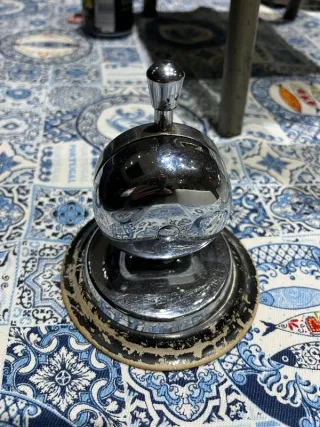 Este es un timbre de hotel antiguo, con un diseño clásico y elegante. En madera base y metal plateado muy bonito y decorativo marca geseibar muy cotizados y decorativos suena perfecto - Acabado cromado brillante.