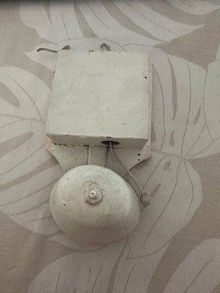 Antiguo timbre de casa, con más de un siglo de historia. Se encuentra en buen estado de conservación, aunque presenta señales del paso del tiempo. - Timbre de metal blanco. - Caja de madera blanca. - Incluye cableado.