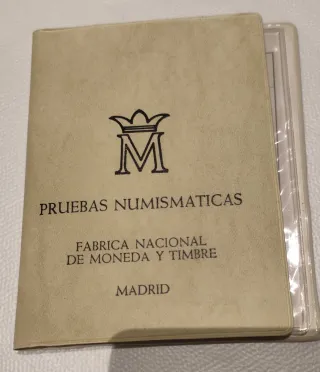 Carpeta de pruebas numismáticas de la Fábrica Nacional de Moneda y Timbre. - Portada con el emblema de la M coronada. - Texto Pruebas Numismáticas. Calidad Proof - Fábrica Nacional de Moneda y Timbre. - Madrid. En su estuche original