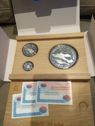 Conjunto de monedas de plata 925 de la Fábrica Nacional de Moneda y Timbre (FNMT) conmemorativo de la aviación española de 1997. Incluye certificados de autenticidad. - Moneda de 25 Euro (Plus Ultra). 168,75 gr. Ligera rozadura (ver foto) - Moneda de 5 Euro (Nieúport). 33,62 gr. - Moneda de 1 Euro. 6,72 gr. - Peso total: 209,09 gramos. - Certificado de Autenticidad para cada moneda. Se entrega con estuche de madera, cápsulas de metacrilato, certificados y cubierta de cartulina FNMT. No ofertar. No cambios. Entrega en mano o envío por correo. #cincuentin, silver, onza, Oz. Inversión segura.