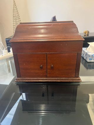 elegante cigarrera, tabaquera, antigua caja para guardar tabaco de madera de caoba o simil con marcas de carcoma tratada y muerta , con persiana móvil para cerrar de ambos lados tipo antiguo escritorio y en el interior cajón para cerillas, para papel de fumar y otro, tal cual se ve en las fotos, falta un tirador. Mode aprox 15x25x10 ( No la tengo delante puede variar de 1, 2 o3 cm. Pieza singular, cigarrera, tabaquera, antigua, madera, sobremesa, coleccion, fumador, decoracion, vintage, original. No negociable.