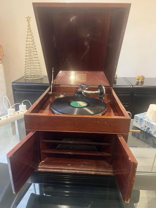 Elegante gramófono antiguo de madera de caoba. Ideal para decoración vintage. - 129 cm de alto x 58 cm de ancho - Mueble de madera oscura con un acabado pulido. - 4 puertas con tiradores de metal. - Diseño clásico con detalles decorativos. - La cuerda está rota