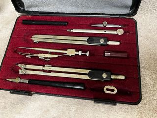 Set de dibujo técnico con compás vintage presentado en su estuche original. - Incluye varias piezas para dibujo técnico. - Estuche negro con interior de terciopelo rojo. Vendo set completo de dibujo técnico con compases, tiralíneas y accesorios, ideal para estudiantes de arquitectura, ingeniería o coleccionistas. Viene en su estuche original con interior de terciopelo rojo. Piezas metálicas en buen estado general, estilo vintage. Perfecto para colección o decoración. 📌 Estado: usado, conservado 📦 Incluye todo lo que se ve en las fotos 📍 Entrega en mano o envío por Wallapop