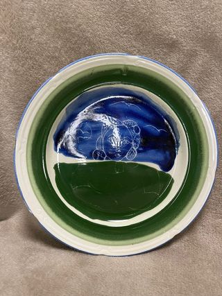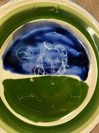 Plato de cerámica decorado a mano con un diseño artístico. - Pintura con motivos de rostro y paisaje. - Tonos azules y verdes vibrantes. - Borde decorado. Vendo plato de cerámica hecho a mano y pintado artesanalmente, con diseño artístico tipo dibujo lineal (rostro femenino y aves). Pieza única, ideal para decoración, coleccionistas o como regalo original. ✨ Artesanal / pieza única 🎨 Pintado a mano 📌 Estado: bueno, con señales normales de uso (ver fotos) 📦 Envío por Wallapop o entrega en mano