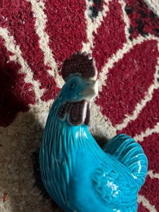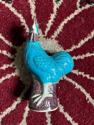Figura decorativa vintage de un gallo en cerámica esmaltada. Su vibrante color azul y el detalle del diseño lo convierten en una pieza llamativa. - Diseño de gallo estilizado. - Acabado brillante. - Base con textura de tronco. Figura decorativa vintage de gallo en cerámica esmaltada, color turquesa muy bonito y con detalles en el plumaje. Ideal para decoración retro, colección o para dar un toque original a la casa. ⚠️ Tiene un pequeño desconchón en el pico (ver fotos). Por lo demás está en buen estado. 📌 Muy llamativa y bonita para cocina/salón.