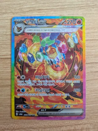Carta Pokémon de Flareon EX en su versión SAR (Special Art Rare), número 202/187 en Coreano. Se encuentra en perfecto estado, del sobre a la funda. Se entrega con funda + toploader. Pertenece a la colección Terastal Festival EX.