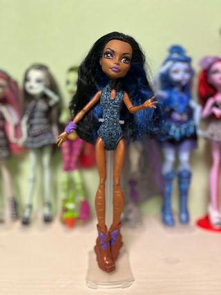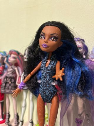 Muñeca Monster High Robecca, modelo Dance Club. - Pelo negro con mechones azules. - Traje de baño azul con estampado geométrico. - Botas marrones con detalles azules.